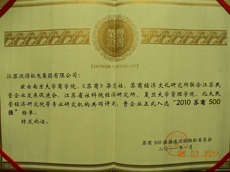 擁有注冊(cè)商標(biāo)證書26個(gè),2006年“WORLD” 獲得江蘇省著名商標(biāo)稱號(hào)、2009年“沃得”商標(biāo)獲得江蘇省著名商標(biāo)稱號(hào);